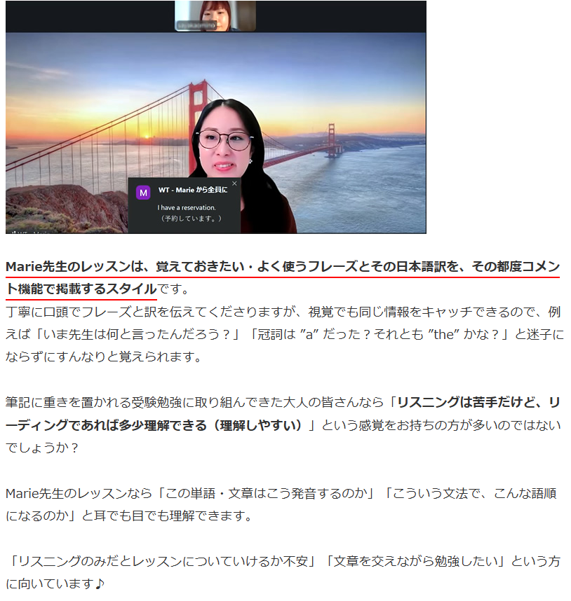 そんな思いから、“旅行英語”をテーマにレッスンを探し、選ばれたのはMarie先生でした。