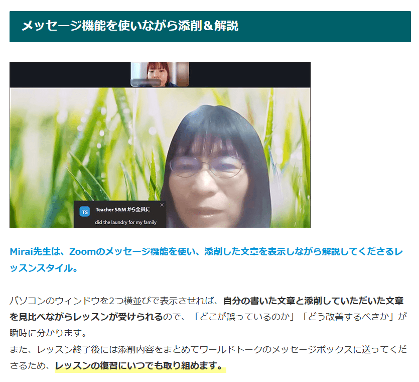 日本文化ならではの表現や、学習における悩みなどがある場合、日本語で講師に相談できるのも、ワールドトークメリットです。