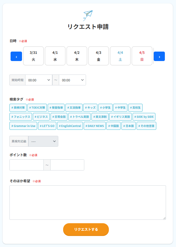 未分類 リクエスト機能追加のお知らせ ワールドトーク運営事務局 2026年4月10日 ・講師が多くて決められない・希望にあった講師が上手く見つけられない そんな時はぜひ、リクエスト機能をご利用ください。|リクエスト機能とは? 希望する「ポイント数」「時間帯」「カテゴリ」を指定してリクエストを投稿すると、条件にマッチする講師へ一斉に通知が届きます。 対応可能な講師がリクエストを承認することで、予約が成立する仕組みです。 ぜひご活用ください! リクエスト機能を使ってみる \英語学習を始めたいと感じた方へ/ ABOUT ME ワールドトーク運営事務局 日本人講師メインのオンライン英会話サイト「ワールドトーク」の運営事務局です。英語学習に役立つ情報を提供できるよう、ブログを更新していきたいと思いますので、よろしくお願いいたします。 \ 今なら無料で日本人講師と体験レッスン! / 無料会員登録をする