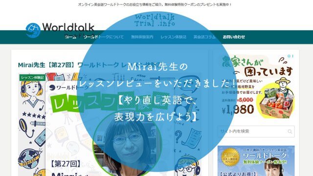 メディア掲載 Mirai先生のレッスンレビューをいただきました!【やり直し英語で、表現力を広げよう】 2026年3月19日 ワールドトーク運営事務局 https://www.worldtalk.jp/blog/wpblog/wp-content/uploads/2024/10/wtblog_logo_re.png ワールドトークブログ Miari先生のレッスンレビューをご掲載いただきましたので、ご紹介いたします。 書くことで見えてくる、自分の「英語の弱点」 こ …