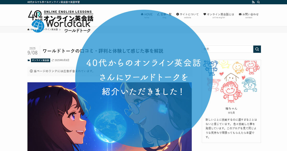 オンライン英会話や英語アプリの体験談、初心者向けの学習法、子どもと一緒に取り組める工夫などを発信する「40代からのオンライン英会話」さんにワールドトークをご紹介いただきました。